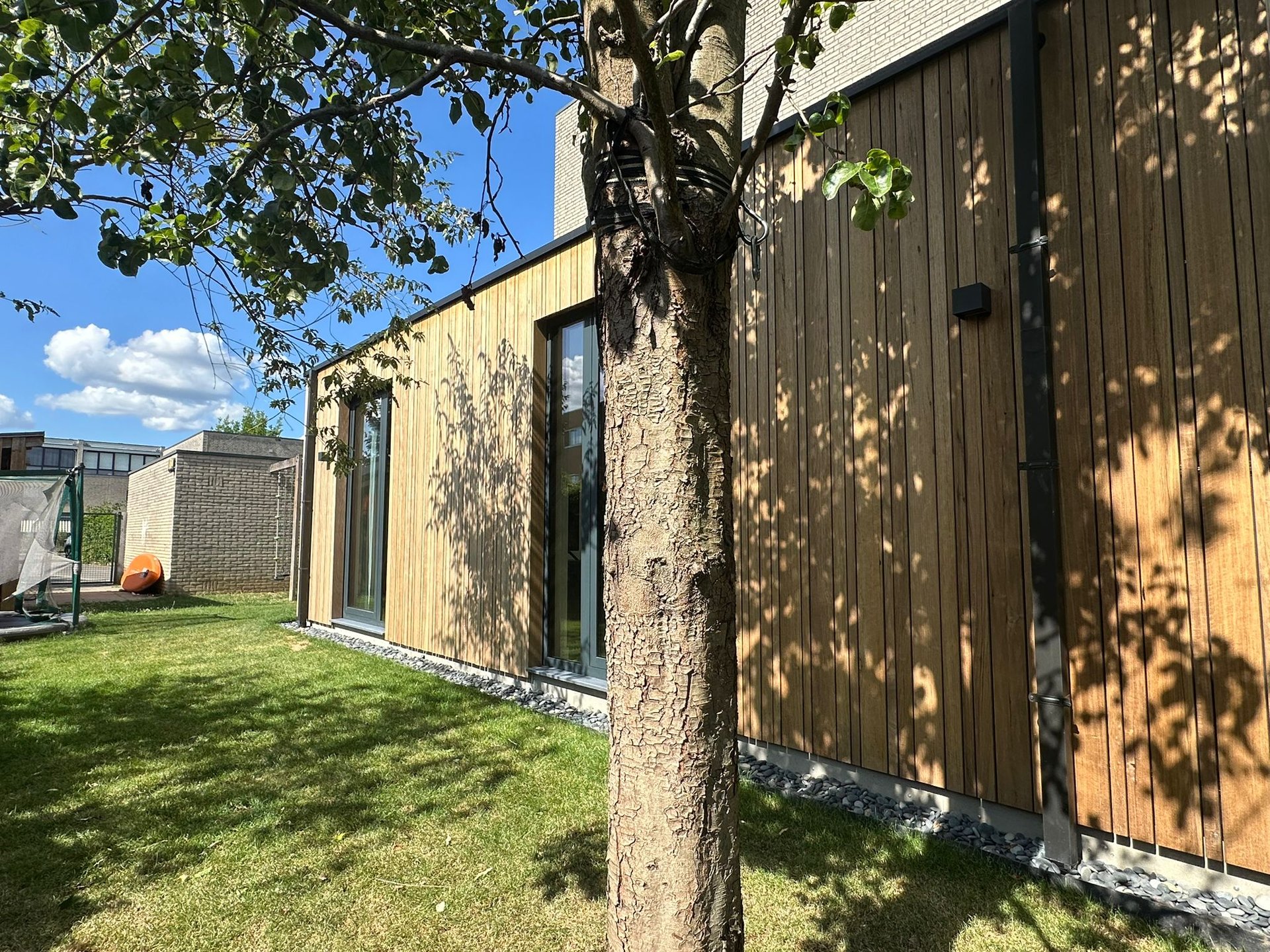 Moderne aanbouw met grote raampartijen en een strakke afwerking. De uitbreiding zorgt voor meer leefruimte en een sterke verbinding met de tuin.
