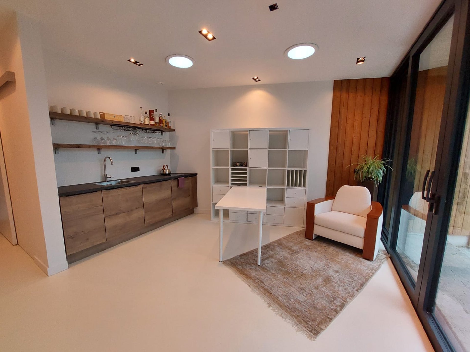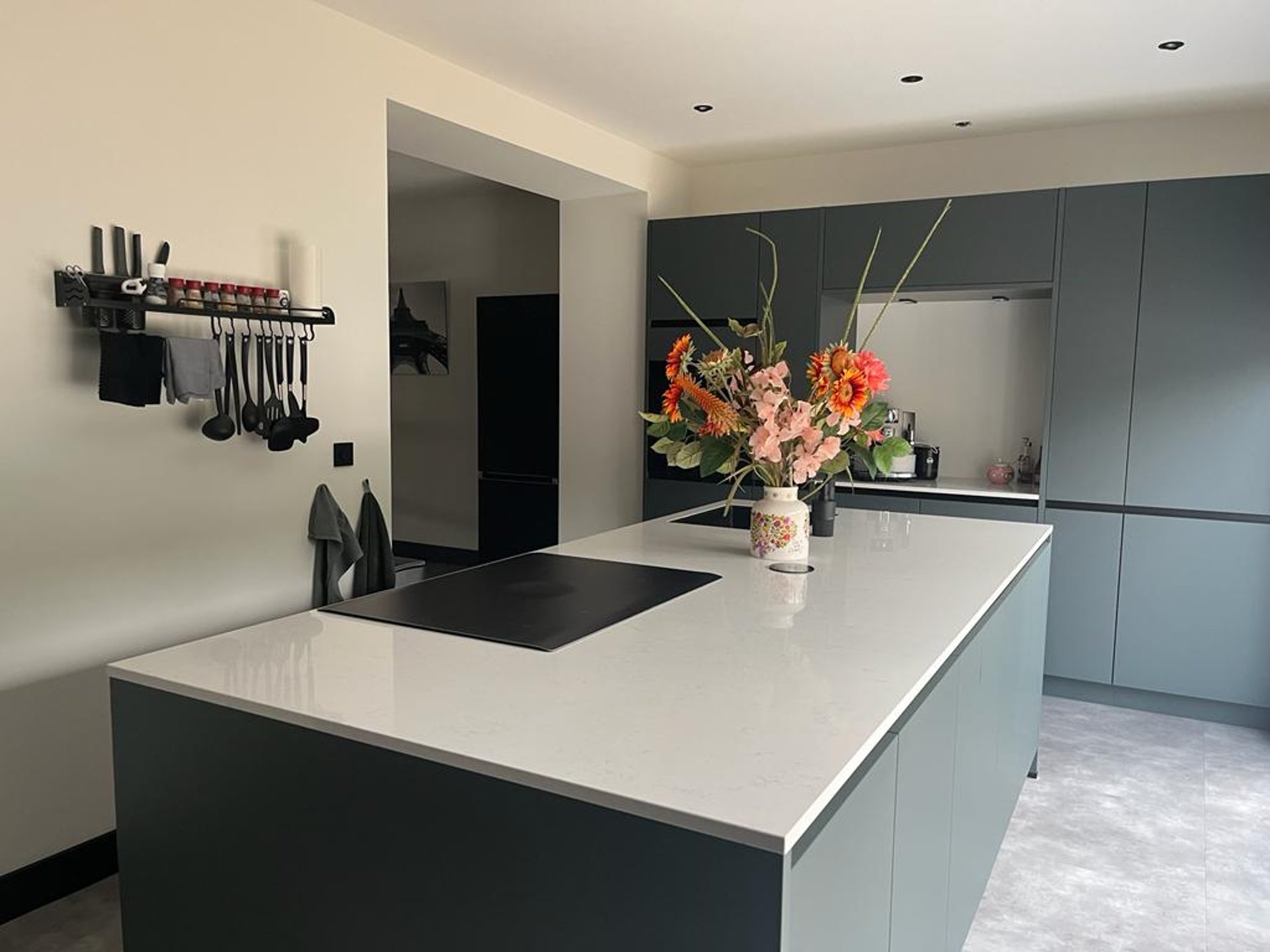 Moderne aanbouw met een open keuken en kookeiland, ontworpen als een lichte leefruimte met directe verbinding naar de tuin.