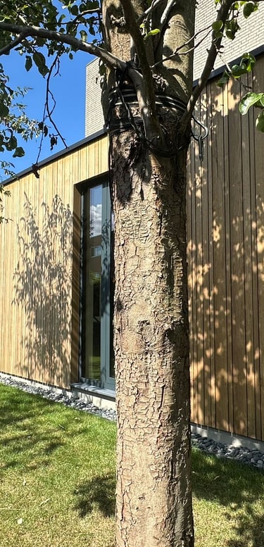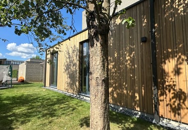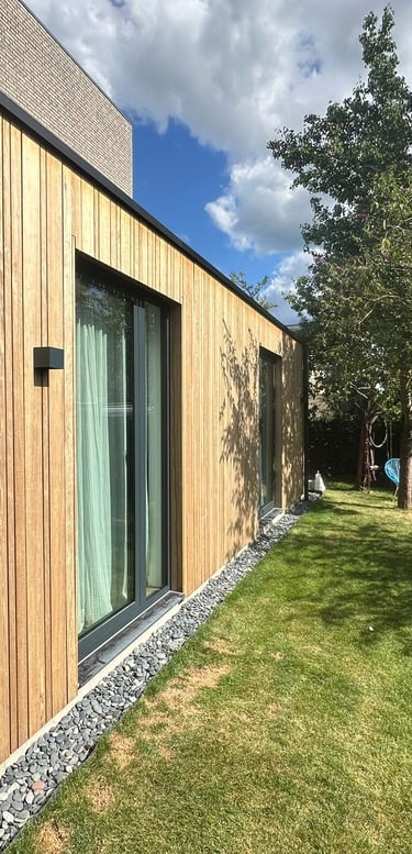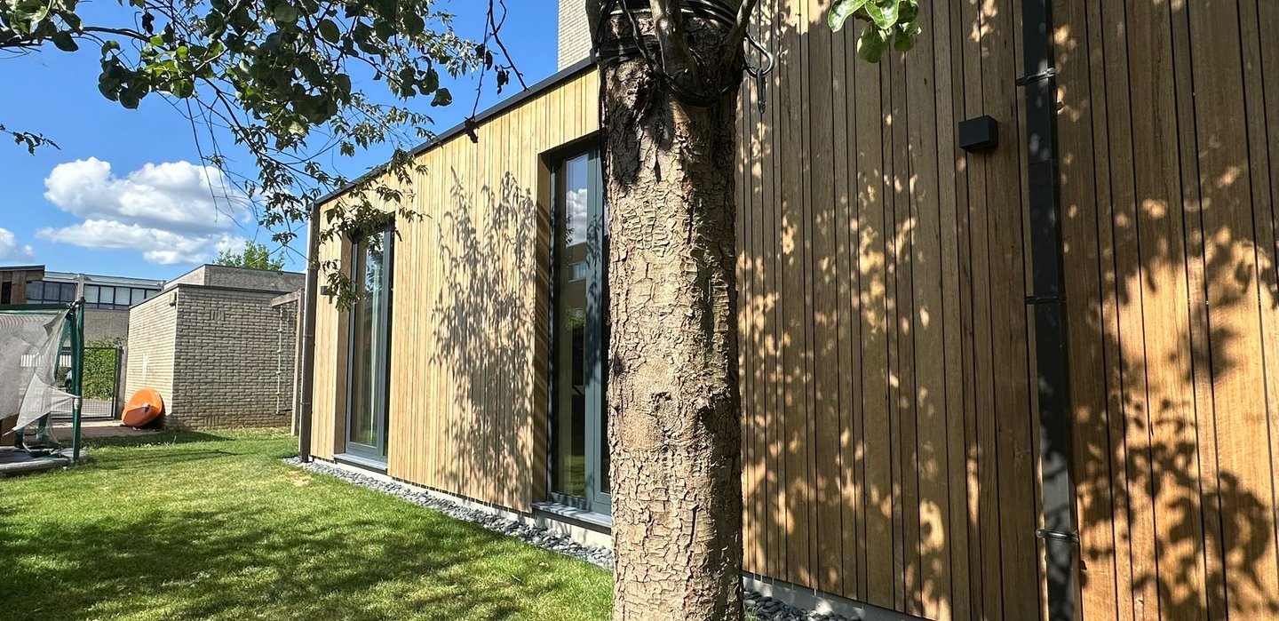 De gevel is afgewerkt met houten gevelbekleding, wat zorgt voor een warme en natuurlijke uitstraling die naadloos aansluit op de woning.