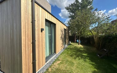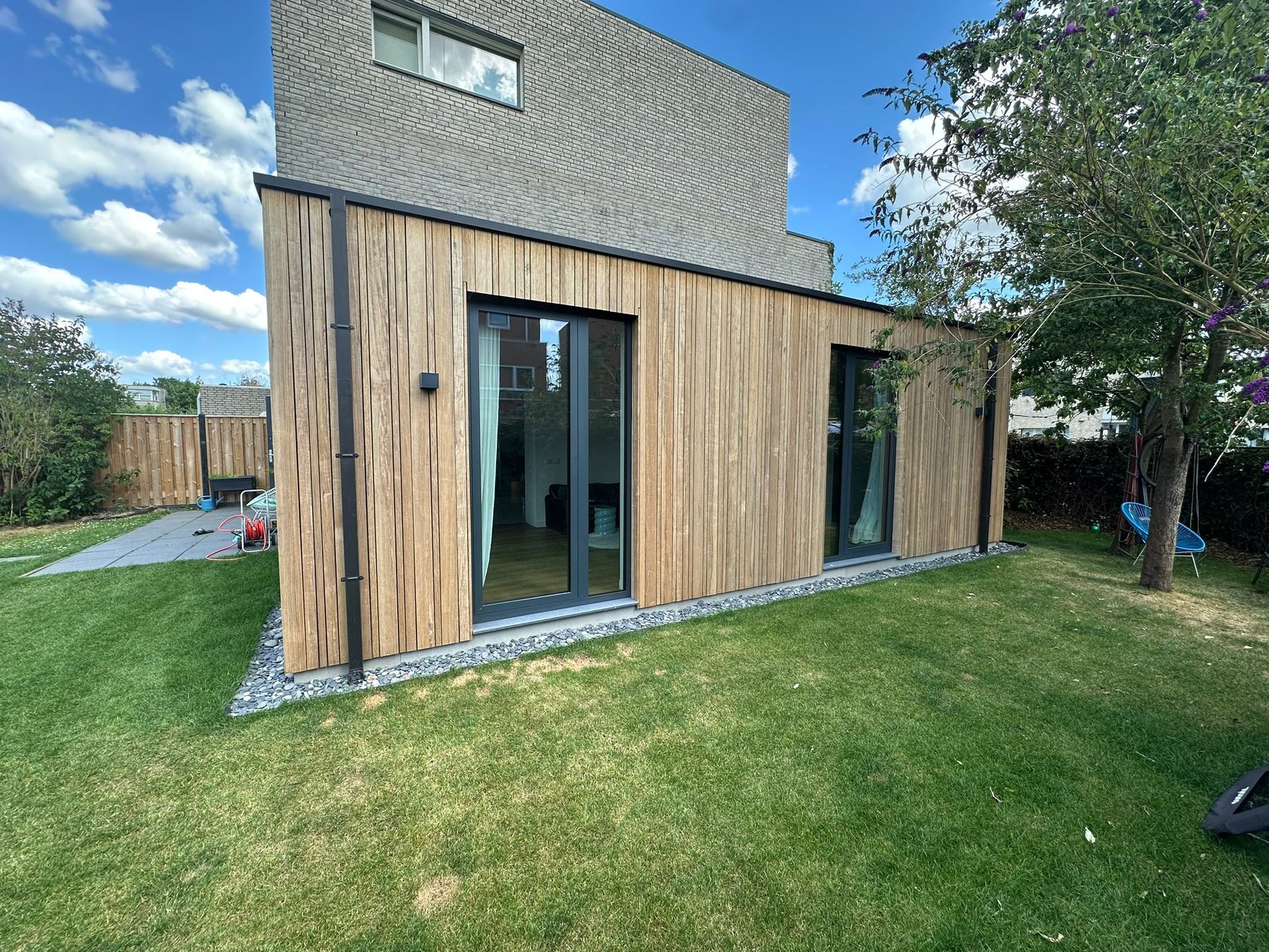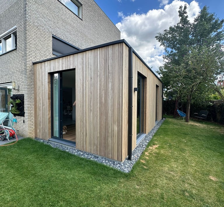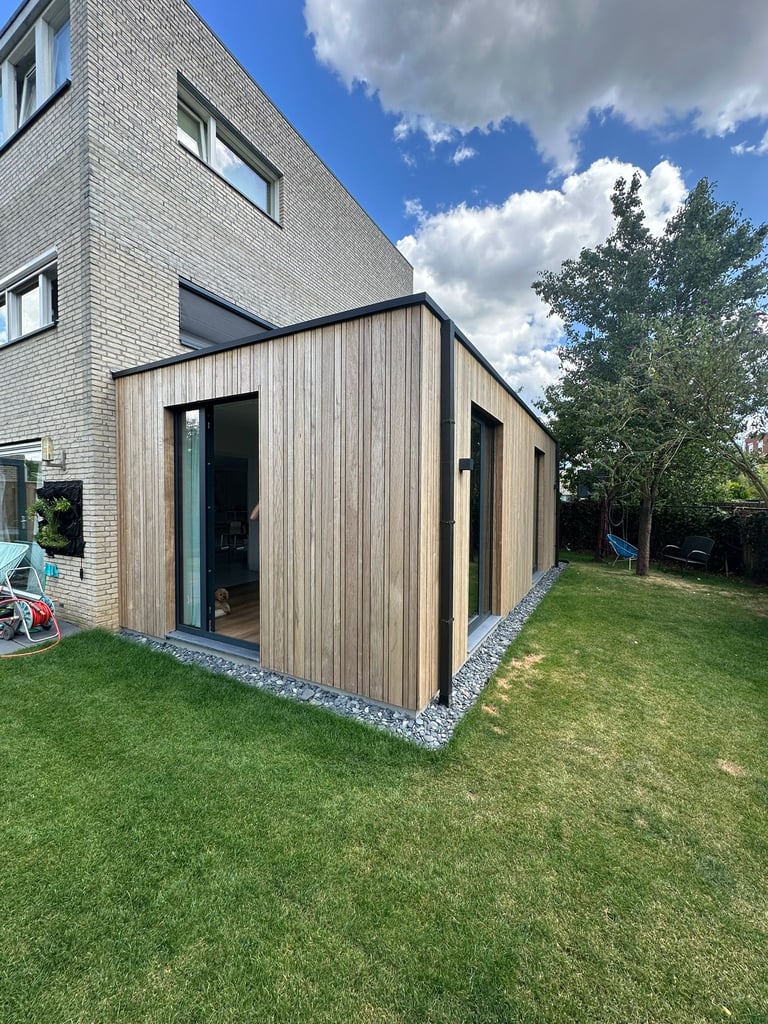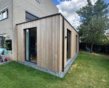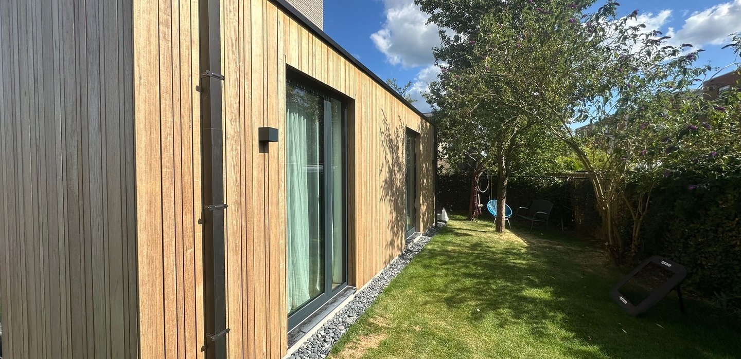 De gevel is afgewerkt met houten gevelbekleding, wat zorgt voor een warme uitstraling die perfect aansluit bij de bestaande woning.