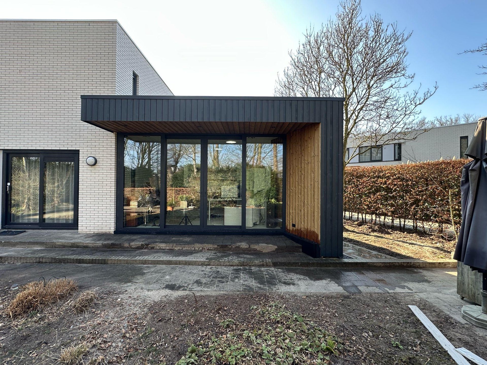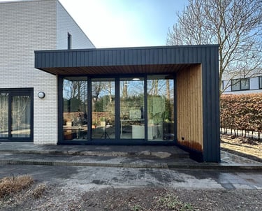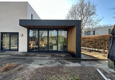 De aanbouw biedt extra leefruimte en sluit perfect aan op de woning en de wensen van de bewoners.
